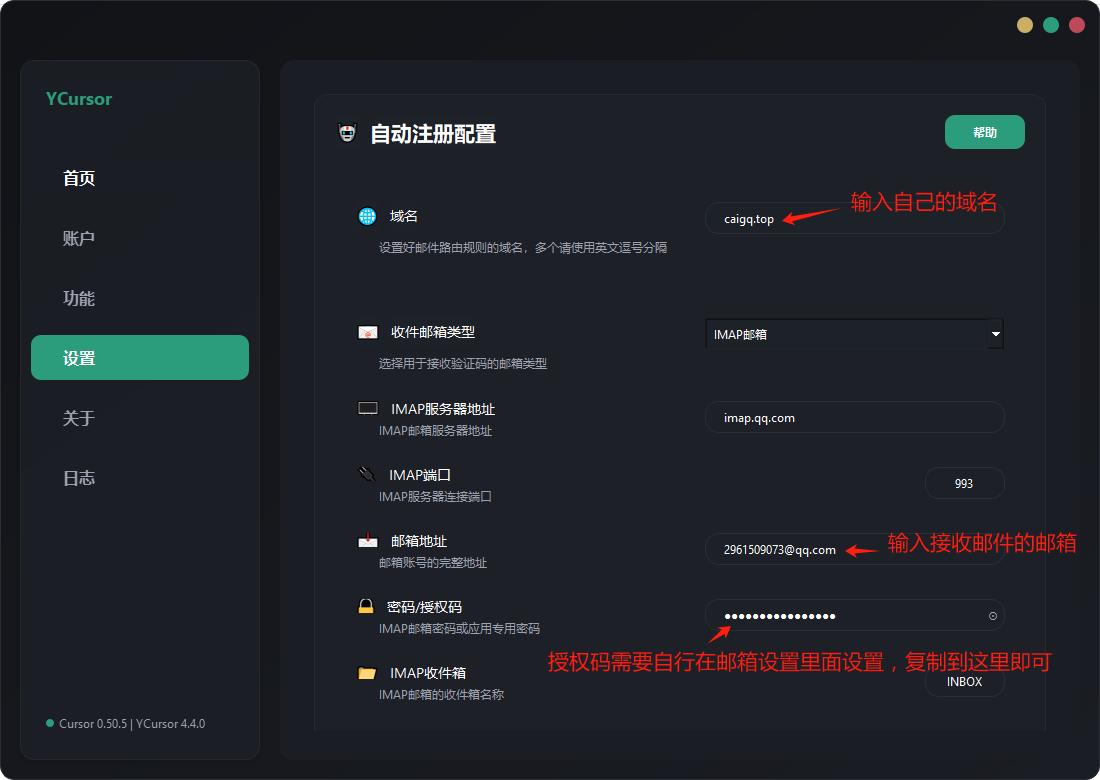 1. 打开 YCursor 的设置,按照图片中将自己对应的域名、邮箱等信息填入