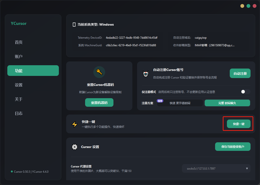 2. 点击功能 -> 快捷一键,至此软件会全自动进行注册邮箱,获取验证码、登录等操作